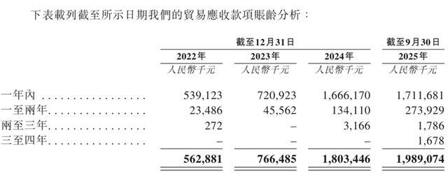 招股书显示,军信股份的贸易应收款正呈滚雪球式增长。2022年、2023年、2024年及2025年前9个月,贸易应收款总额分别为5.94亿元、8.09亿元、18.59亿元和20.65亿元。在扣除亏损拨备后,账面值仍分别高达5.63亿元、7.66亿元、18.03亿元和19.89亿元。