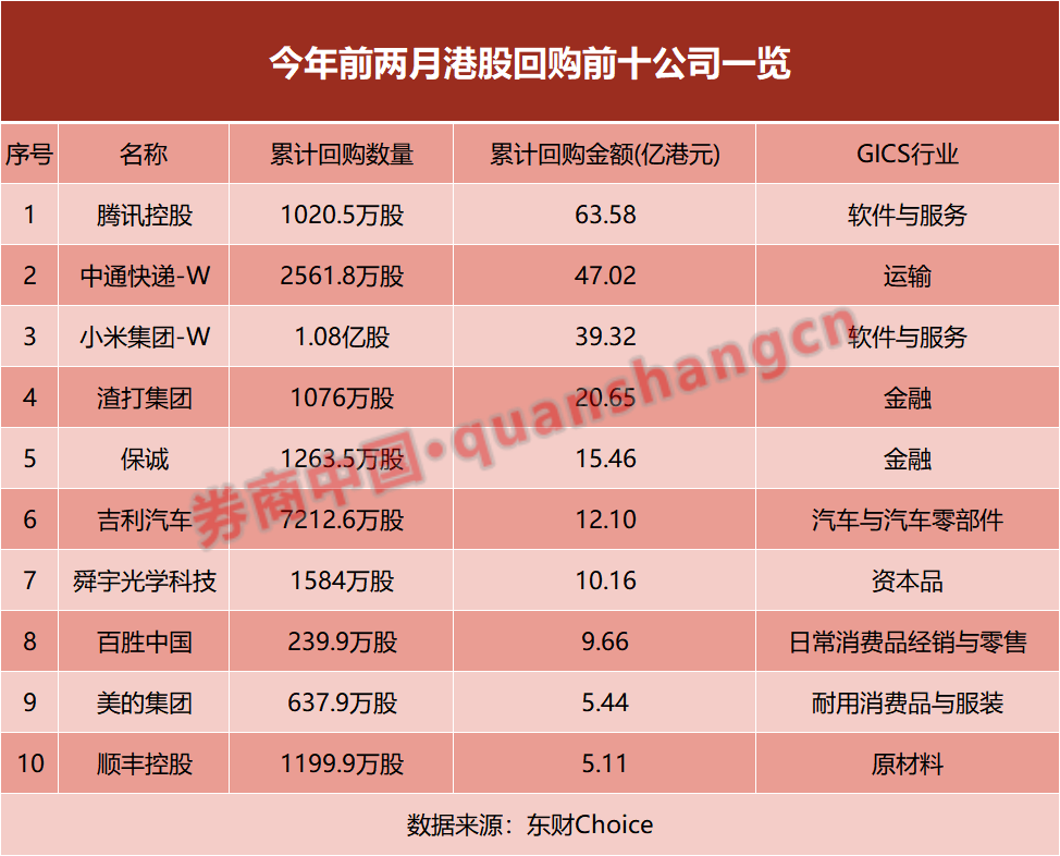 农历新年伊始,港股上市公司前两个月的回购成绩单正式揭晓。