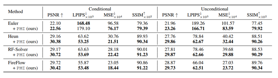 在图像重建(Reconstruction)任务中,PMI表现出了统治级的性能。实验数据显示,在相同的采样步数下(如20步):